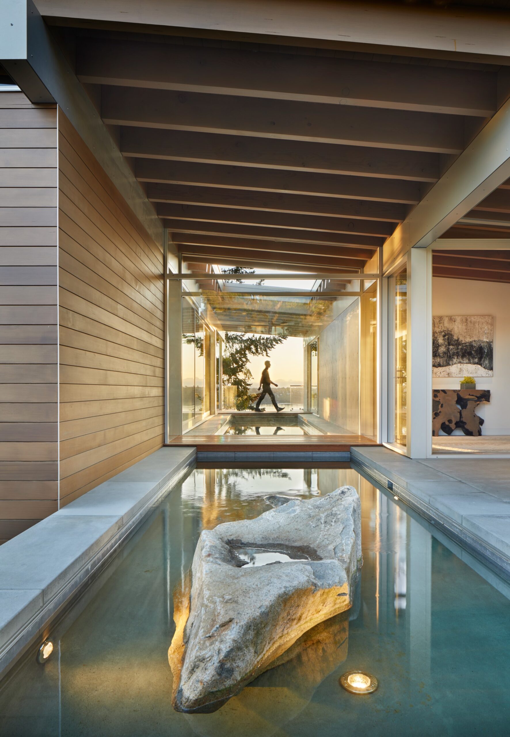 Natural features of the site were left intact to help integrate the structure into its surroundings. Time spent in Japan further enhanced Werner’s understanding of the impact water can have within an architectural setting. “Japan was a game-changer for me. Their exquisite gardens with koi ponds and sculptural Japanese pines are intrinsically beautiful and approach a new level of refinement,” he says.